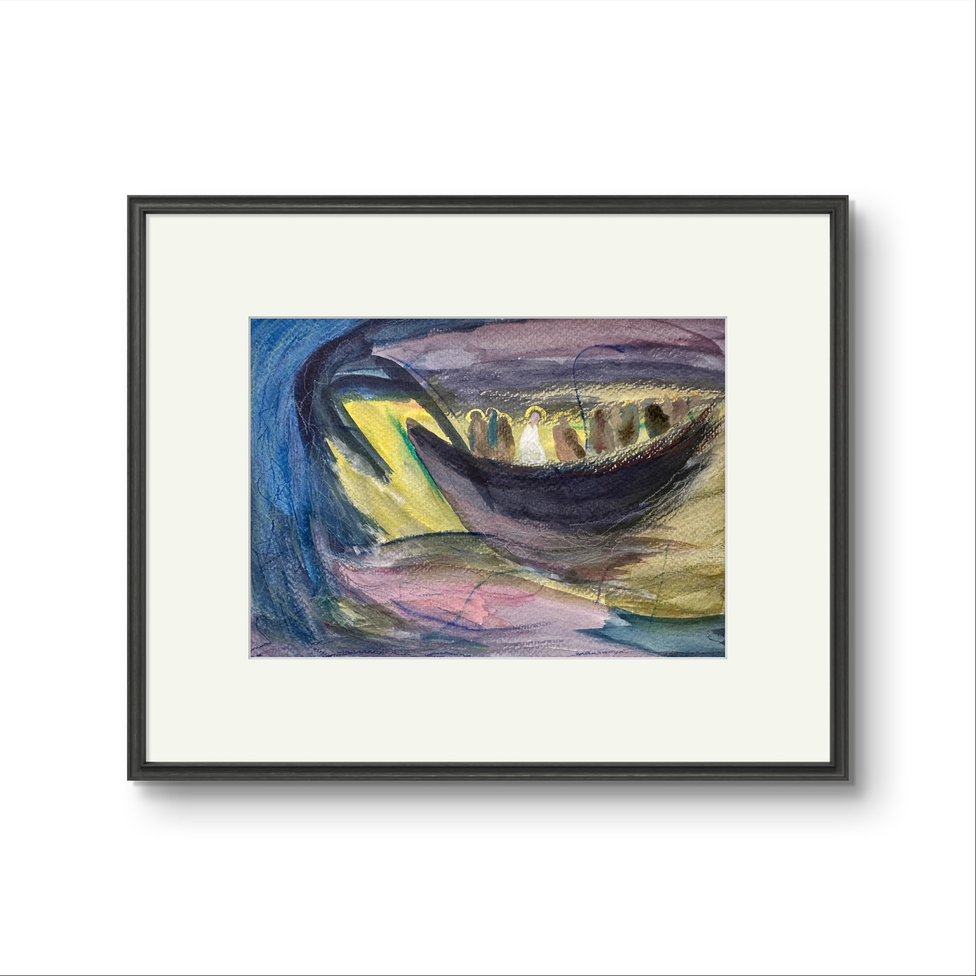 The watercolor invites us to contemplate our own spiritual mission. What hooks are we casting into the sea of our lives? Are we willing to be fishers of men, to seek and rescue lost souls with patience and love? In the stillness of the boat, alongside Jesus and His disciples, we find the answer: we must trust in divine guidance, cast our nets with faith, and await with hope the miracle of an abundant catch.