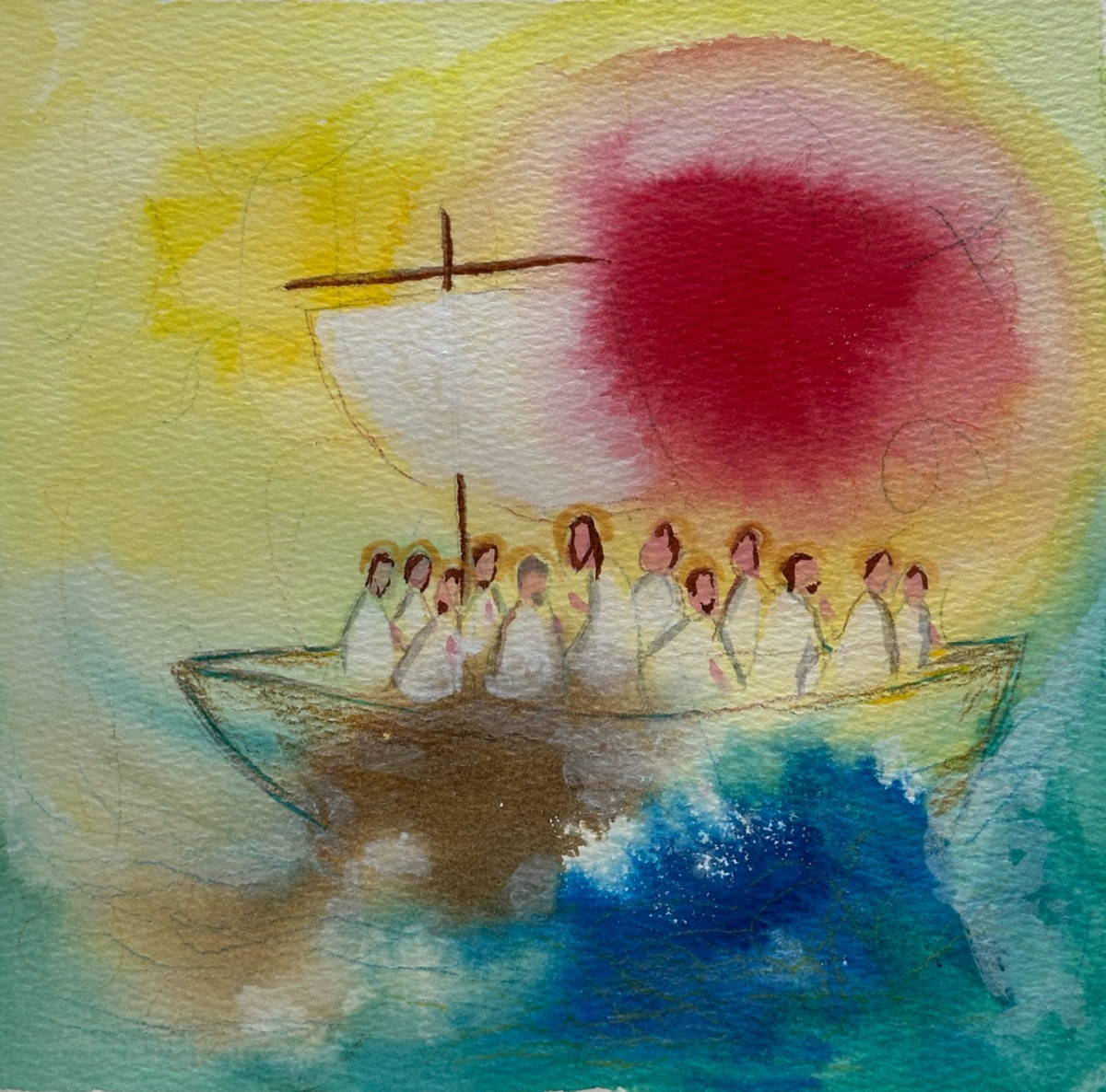 La técnica de la acuarela, con sus trazos suaves y fluidos, refuerza el sentido de calma que se establece tras el milagro. La transparencia de los colores refleja la fragilidad y belleza de la fe, que se fortalece en medio de la adversidad.