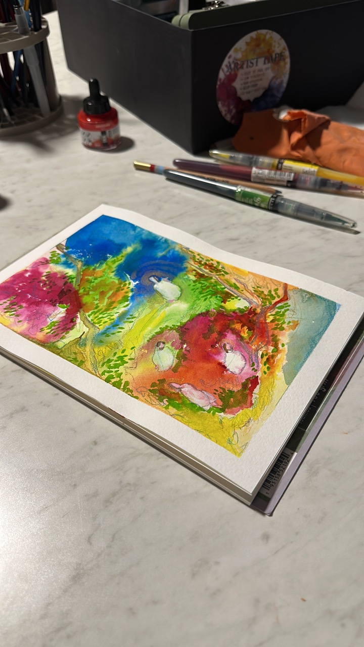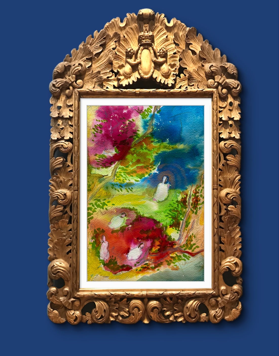 Así, la acuarela no solo captura un momento bíblico, sino que nos invita a contemplar la belleza de la vulnerabilidad humana y la infinita compasión divina. En la quietud del jardín, se nos recuerda que, aun en nuestros momentos de mayor debilidad, somos sostenidos por el amor y la gracia de Dios.