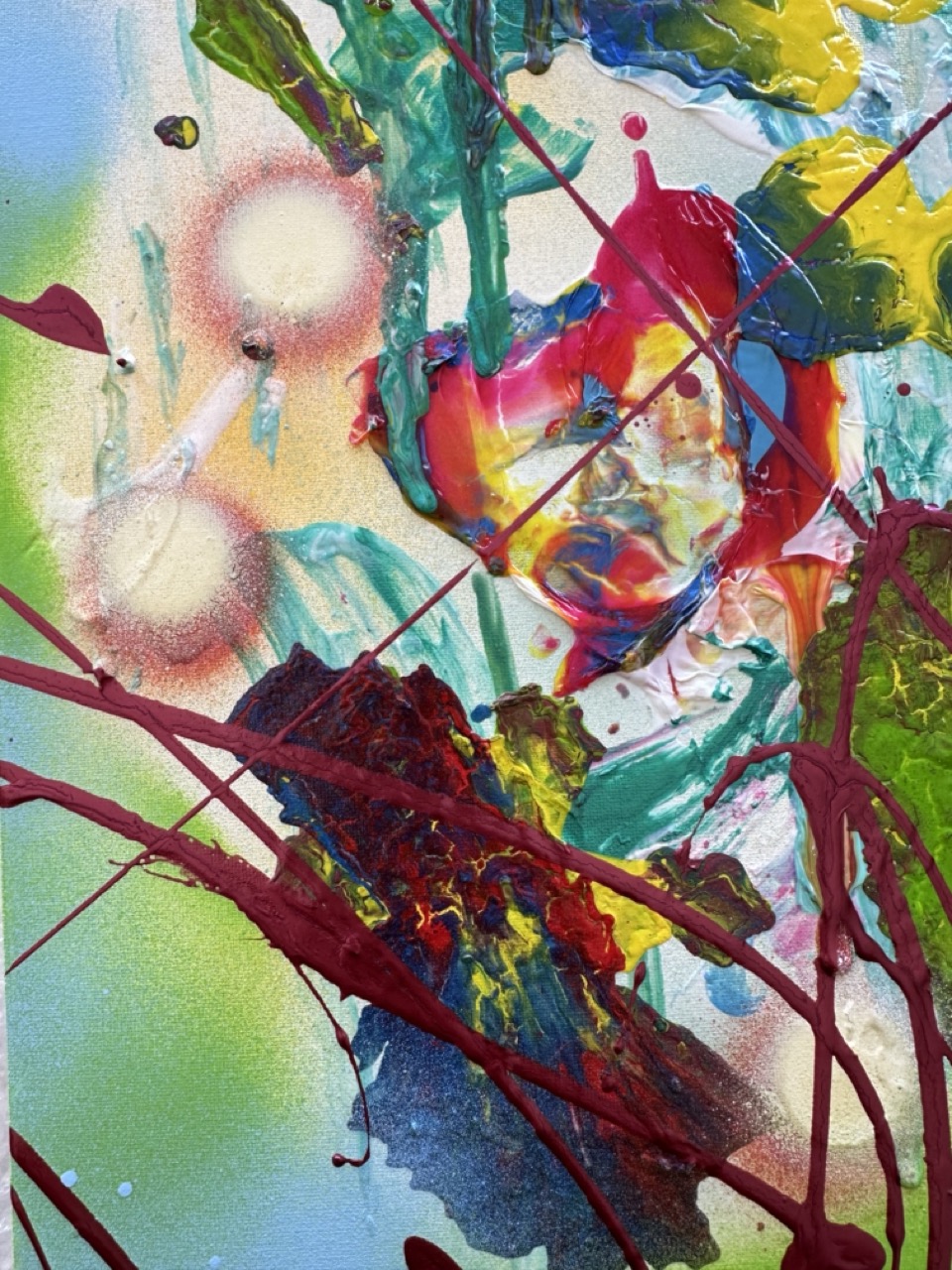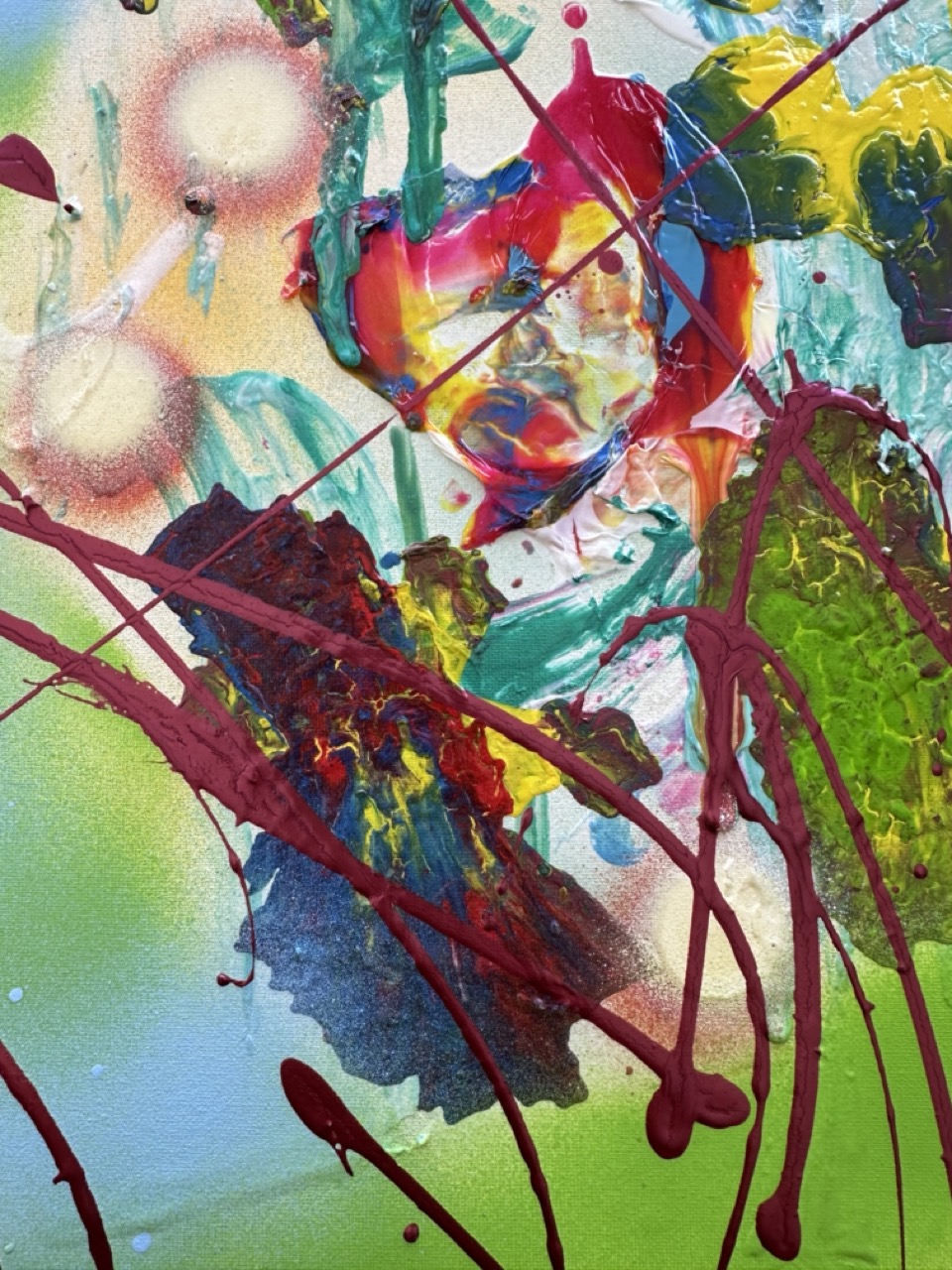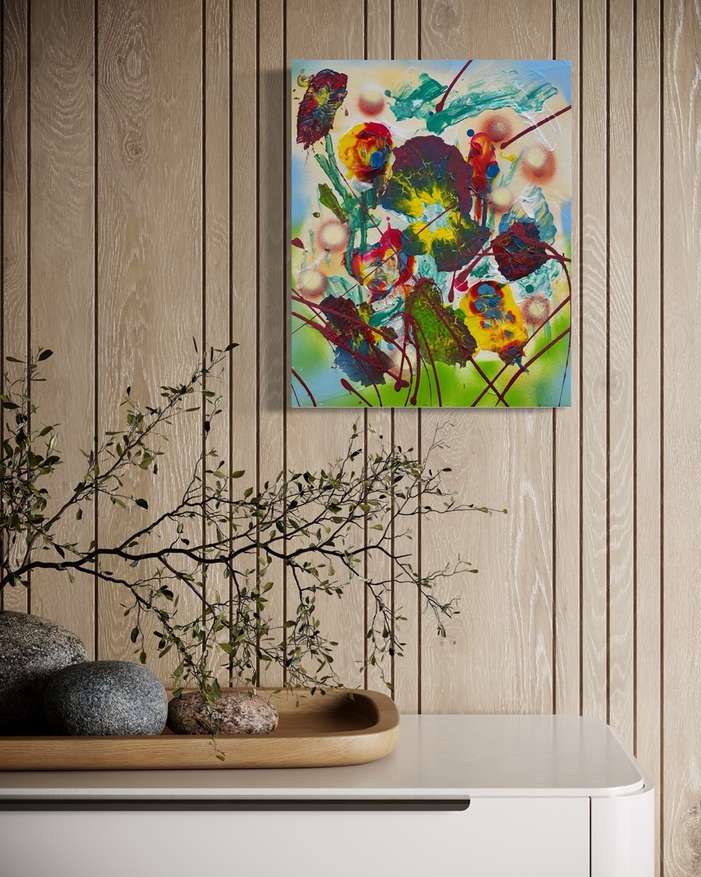 En “Luciérnagas”, la explosión de colores vibrantes y las formas abstractas pueden interpretarse como esas luces que titilan en la oscuridad. Los tonos amarillos y rojos sugieren la calidez y la energía de la vida, mientras que las pinceladas enérgicas evocan el movimiento frenético de las luciérnagas en su danza nocturna. La obra invita al espectador a sumergirse en esa experiencia sensorial, recordando la sensación de ser parte de algo mágico y efímero.
