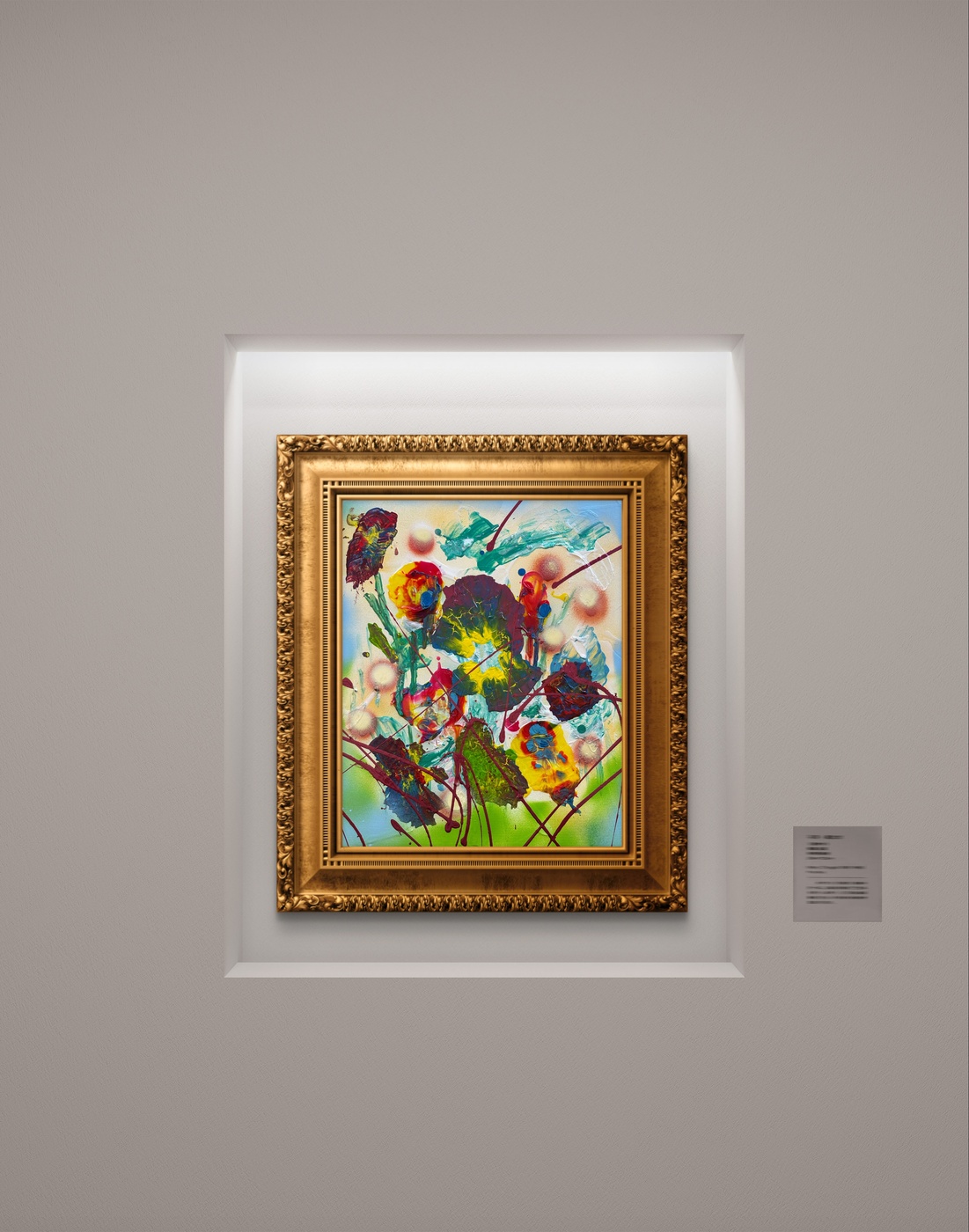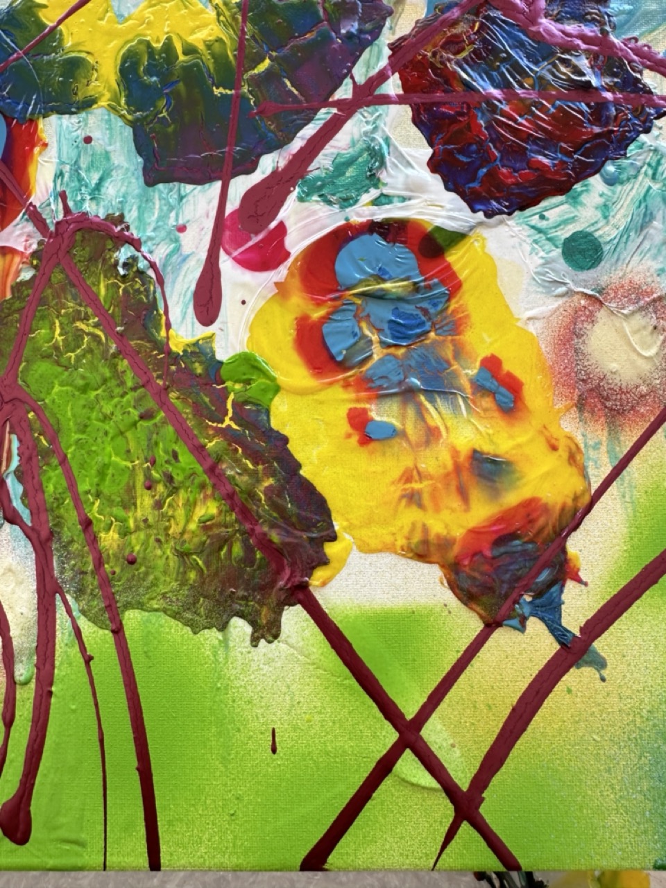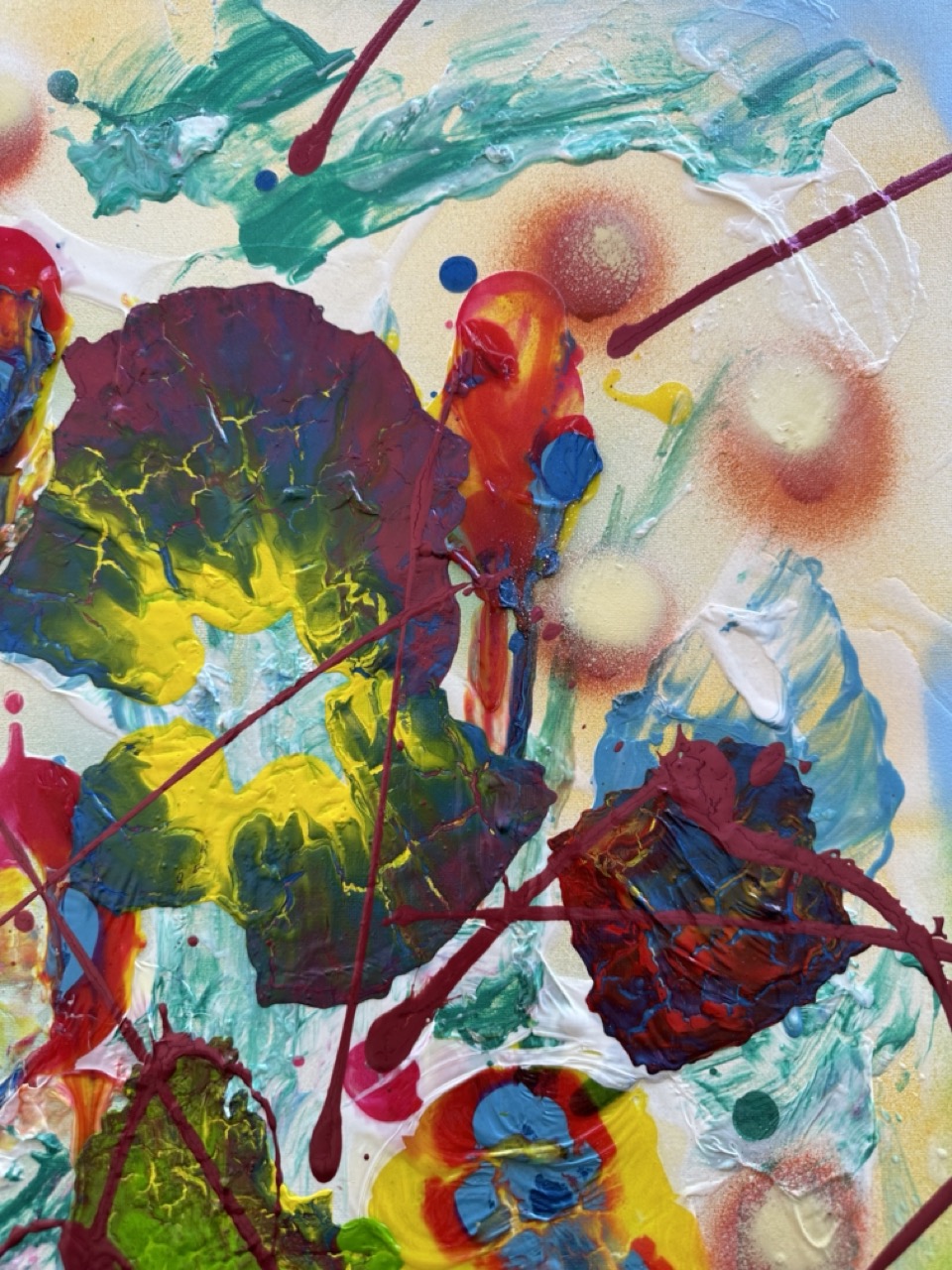 En “Luciérnagas”, la explosión de colores vibrantes y las formas abstractas pueden interpretarse como esas luces que titilan en la oscuridad. Los tonos amarillos y rojos sugieren la calidez y la energía de la vida, mientras que las pinceladas enérgicas evocan el movimiento frenético de las luciérnagas en su danza nocturna. La obra invita al espectador a sumergirse en esa experiencia sensorial, recordando la sensación de ser parte de algo mágico y efímero.